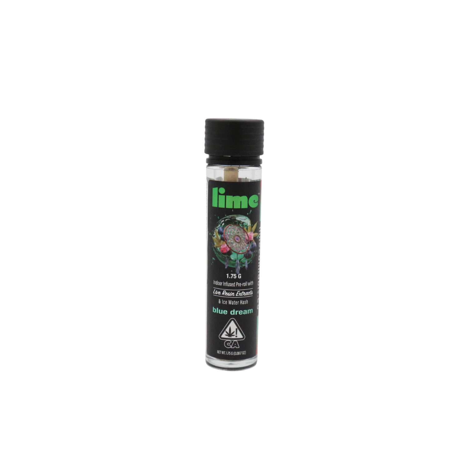 If you like our Diamond & Hash infused Lil' Limes but need a bigger option, we’ve got you. Our 1.75-gram pre-rolls are triple infused just like the minis. Each pre-roll has its own unique terpene profile to deliver the utmost high. Check out all of the incredible strains and find your favorite buzz. // Strain: Blue Dream is a slightly sativa dominant hybrid strain that is a potent cross between the hugely popular BlueberryX Haze strains. This infamous bud boasts a moderately high THC level that ranges from 17-24% on average and a myriad of both indica and sativa effects. Users describe the Blue Dream high as having an immediate onset of an uplifting cerebral head high that leaves you completely motivated and focused with waves of creative endergy that hit quickly and hard. This is accompanied by a mellow relaxing body high that leaves you warmed, numb, and completely pain free.